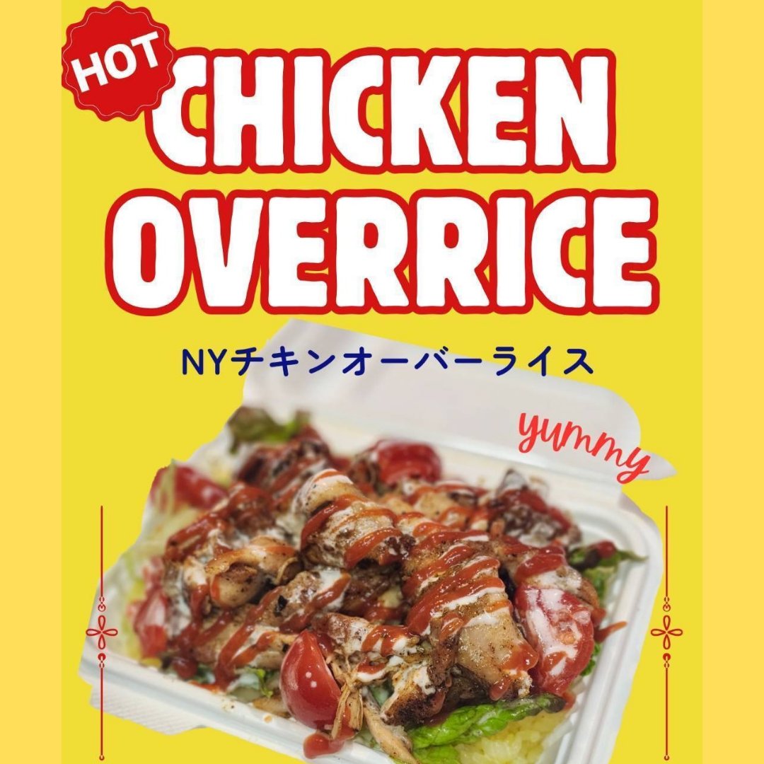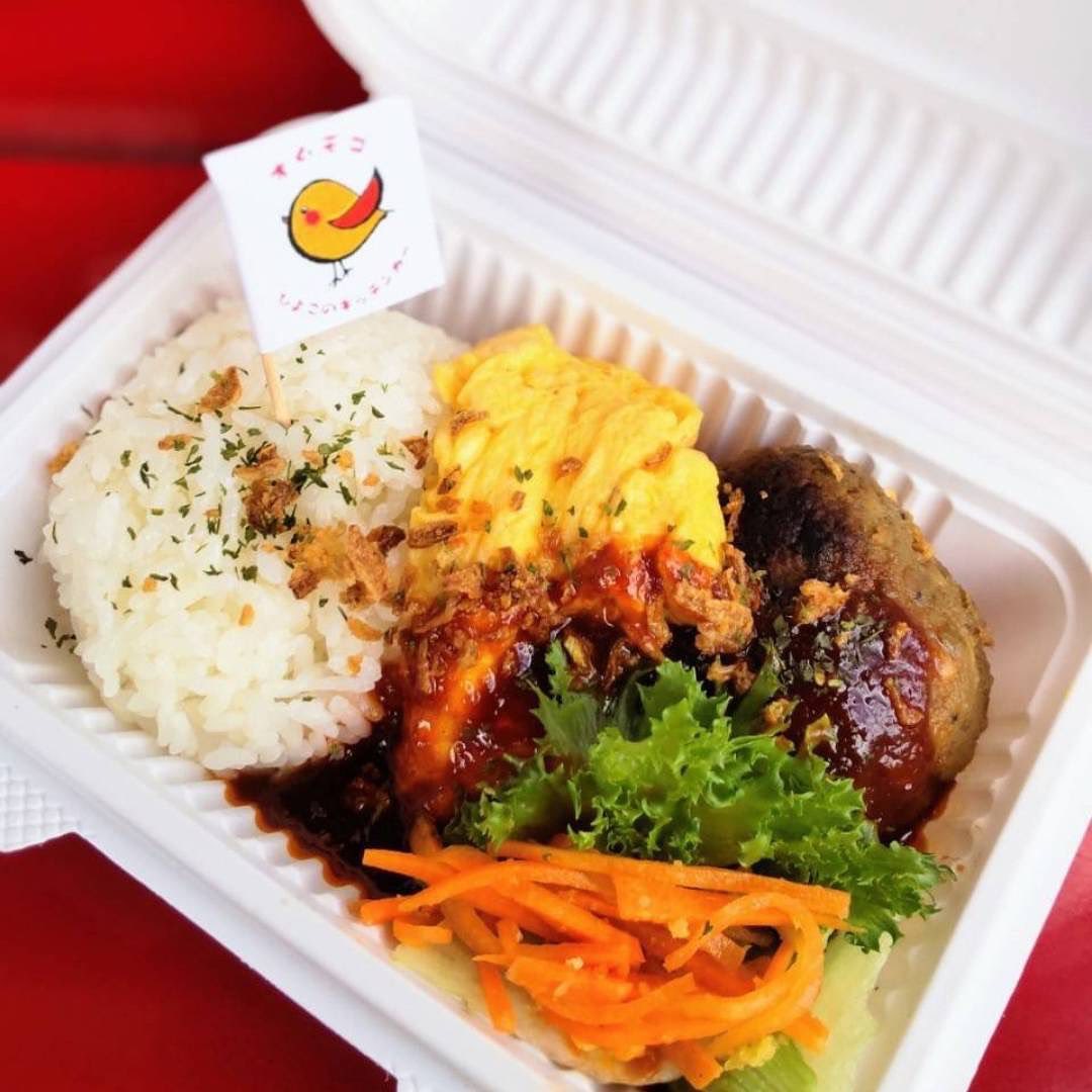 キッチンカーで、オムモコ(ロコモコ)、チキンオーバーライス、タコライス、ガーリックシュリンプ、ドリンクなど